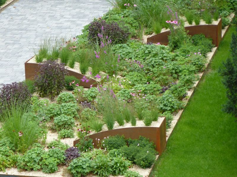 Markante, mit Gräsern bepflanzte Hochbeete aus Cortenstahl in farbenfrohen Staudenbeeten flankieren den Hauptweg. Das Betonpflaster in changierenden Grautönen unterstützt die einladende Gestaltung.