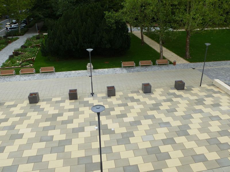 Durch großformatige Betonplatten in drei verschiedenen Farbtönen erhält der Platz einen lebendigen Charakter.