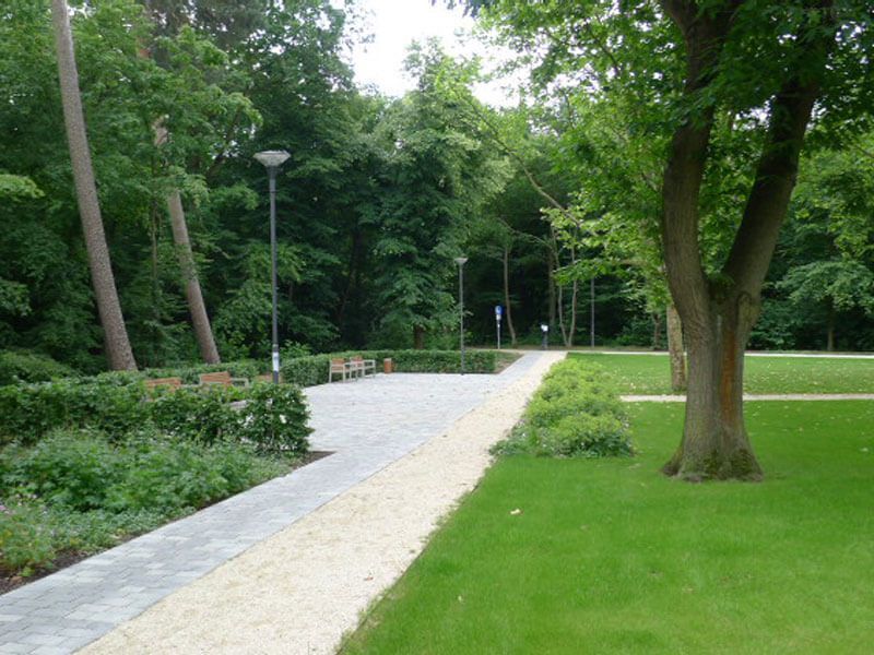 Die verwilderte Fläche des Heegwalds wurde parkartig angelegt und neue wassergebundene Wege mit gepflasterten Allwetterstreifen hergestellt.