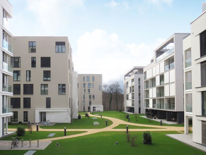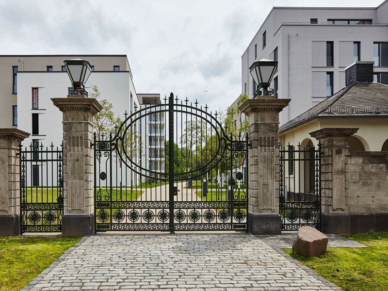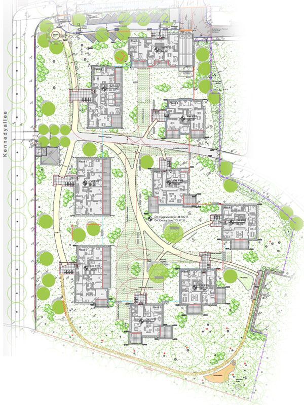 Offene Rasenflächen mit Solitärbäumen und Gehölzclustern um die Wohngebäude prägen heute das neue Wohnquartier und bieten zahlreiche Blickbeziehungen zur denkmalgeschützten Villa Mumm. Der Charakter des Waldparks ist im südlichen Bereich des Grundstücks noch zu spüren.