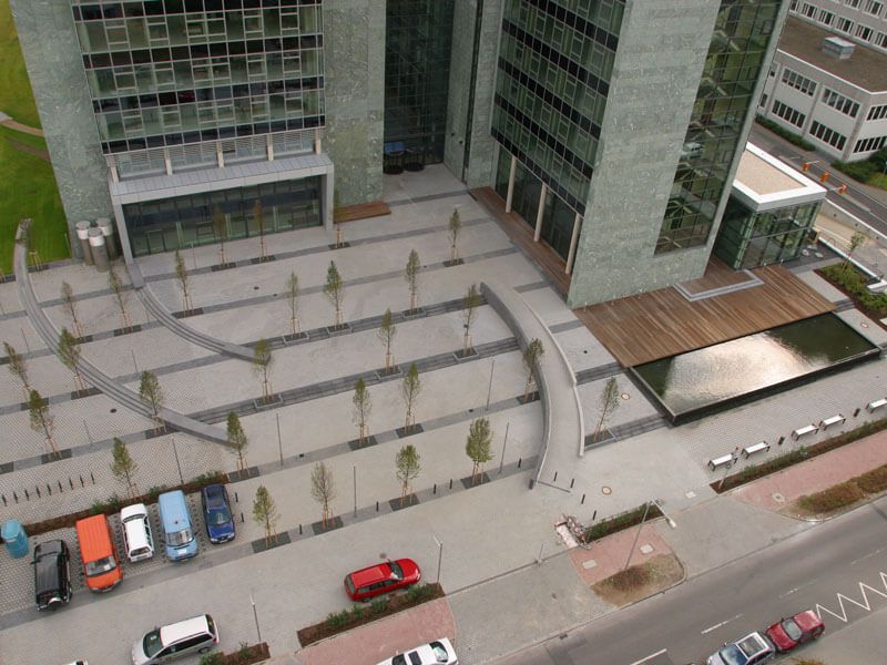 Der Vorplatz bildet den repräsentativen Rahmen für das Bürohochhaus. Gebogene Stufenläufe und die Zugangsrampe schneiden durch dunkle Pflasterbänder. Die darin angeordneten Hainbuchen strukturieren den Platz. Ein großes Holzdeck für Veranstaltungen kragt über ein Wasserbecken. Den Höhenunterschied zur Straße kompensiert eine Wasserwand.