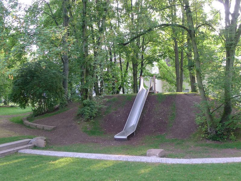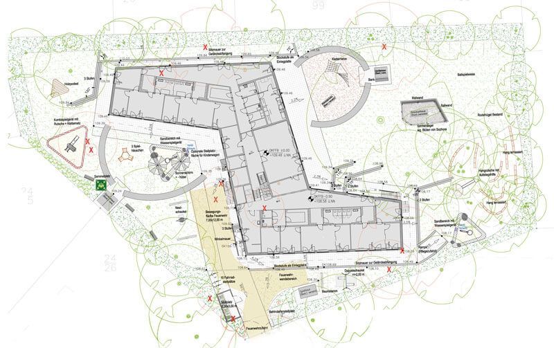 Eine Plattenfläche rahmt den Kita-Neubau und verbindet alle Spielbereiche barrierefrei miteinander. Gleichzeitig bietet sie Aufenthaltsfläche vor den Gruppenräumen und nimmt die Feuerwehrflächen auf. Die vorhandenen Spielgeräte, ein großes Spielhaus und Gerätehäuser wurden wiederverwendet und durch neue Spielgeräte ergänzt.