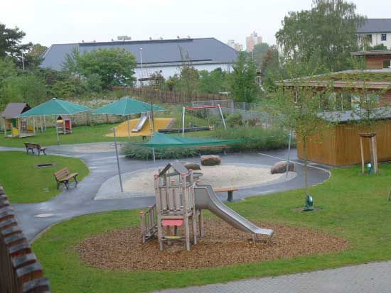Die Spielflächen der 6-gruppigen Kita im Stadtteil Frankfurter Berg sind den Gruppenräumen des Gebäudes zugeordnet. An die umlaufende Plattenfläche des Gebäudes schließt die Bewegungsfläche aus Asphalt zum Toben und Rädchenfahren an.