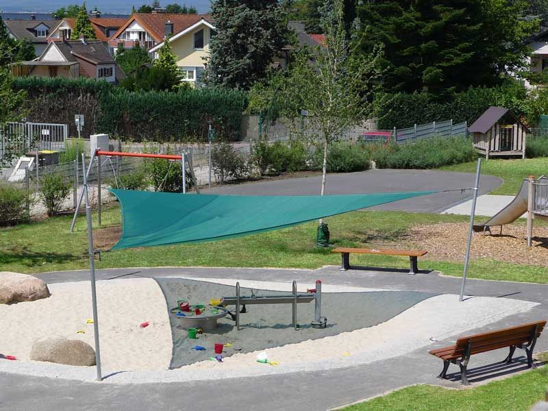 Entlang der Nordostseite des Gebäudes gliedern schmalkronige Hainbuchen den langgestreckten Freiraum und schirmen die Kita zum höher gelegenen Nachbargrundstück ab. Größere Bäume, wie Feldahorn, dienen im Hauptspielbereich als Schattenspender im Sommer. Strauchpflanzungen und Kletterpflanzen zur Zaunbegrünung sorgen für Sichtschutz und bilden den grünen Rahmen für das Grundstück.