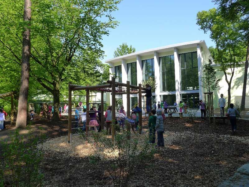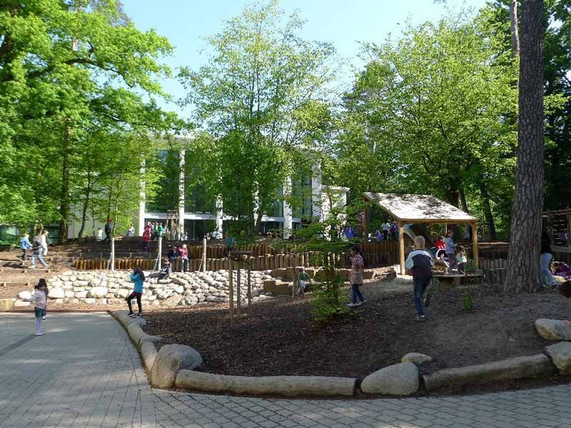 Durch die Umgestaltung des Schulhofes wurde ein Beitrag zu der im pädagogischen Konzept der Waldschule verankerten Umwelterziehung geleistet. Die Schule fühlt sich schon allein durch ihre Lage mit der Natur verbunden und setzt sich für den Schutz der Umwelt ein. Die Förderung der Sinneswahrnehmung sowie der Selbsttätigkeit der Kinder und das erlebnisintensive Bewegen waren daher ein wichtiger Teil der Planung. Zudem galt es den natürlichen Charakter des Umfeldes aufzunehmen und weiter zu entwickeln, sowie bestehende Elemente in die Planung mit einzubeziehen. So wurden größtenteils vorhandene Holz-Spielgeräte auf dem Schulgelände wieder eingebaut und natürliche Baustoffe wie Sandsteinquader und Findlinge wiederverwendet. Der mit Robinienpalisaden eingefasste Sandspielbereich und der Fallschutz aus Rindenhäcksel betonen den Waldcharakter. Sträucher und Kleinbäume im Schulgelände bilden den grünen Rahmen für die dazwischen liegenden Spielbereiche und dienen als Ausgleich für notwendige Baumfällungen.