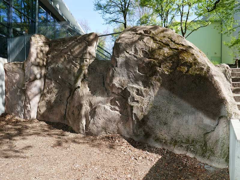 Die großen Höhenunterschiede im Gelände werden durch eine bestehende Treppe, eine Kletterwand aus großen Kieseln und mit Holzbohlen bzw. -palisaden abgefangen. Am Geländesprung zwischen dem grünen Klassenzimmer und dem Neubau wurde das Spielangebot um eine 1,50 m hohe Kletterwand in Sandsteinoptik erweitert. Eine mäandernde offene Entwässerungsrinne leitet das Oberflächenwasser der höherliegenden befestigten Flächen durch den Schulhof in eine Matschgrube.